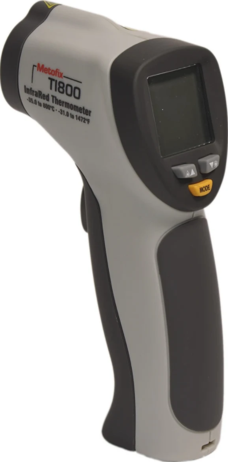 Metofix pintalämpömittari TI800. Kaksi tähtäyspistettä ilmaisevat miltä alueelta lämpötila mitataan. Luotettava mittaus aina 800°C asti.