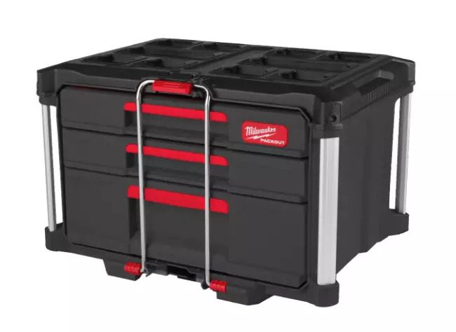 Milwaukee PackOut 2+1-os vetolaatikko. Vetolaatikollinen PackOut työkalupakki mahdollistaa helpon pääsyn työkaluihin jopa silloin, kun se on asetettu PackOut pinon alimmaiseksi. Liukuvat kuulalaakeroidut vetolaatikot kestävät jopa 11 kg painon. Nopeasti liikuteltavat jakajat mahdollistavat pakin mukauttamisen käyttöön sopivaksi. Turvatangon lukitseminen estää laatikoiden aukeamisen kuljetuksen aikana. Vetolaatikot voidaan lukita riippulukolla varkauden estämiseksi. Valmistettu iskunkestävästä polymeerista. Osa PackOut säilytysjärjestelmää.