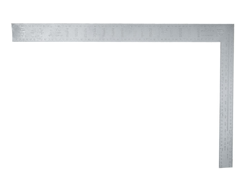 Rakentajan suorakulma. Mittalevyn pinnan asteikko jaoteltu 2 mm:n välein, kääntöpuolen 1/8-tuuman välein. Teräksinen suorakulma, hiottu pinta ja ruostumista estävä suojalakkaus.