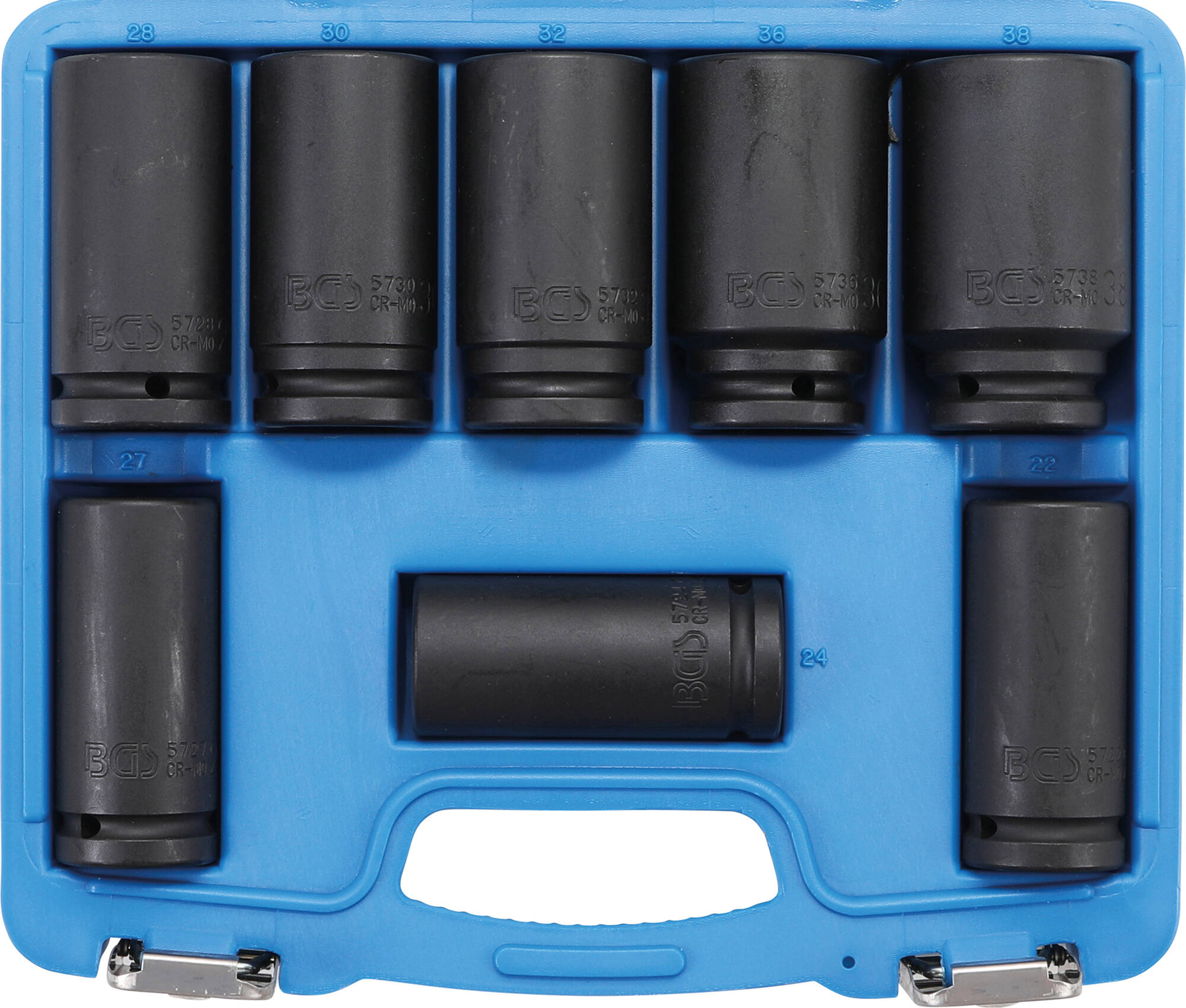 Voimahylsysarja erikoispitkä (pituus 90 mm), kuusiokanta, 3/4", 8-osainen. Sisältää: 3/4" 22 - 24 - 27 - 28 - 30 - 32 - 36 - 38 mm.