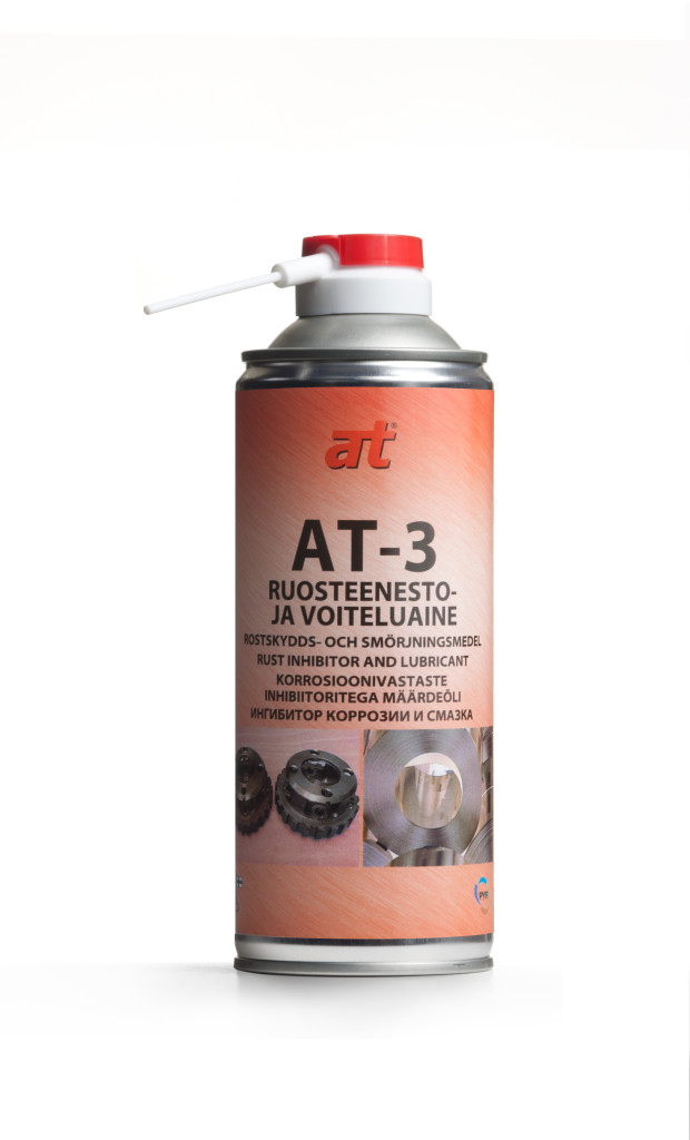 AT-3 ruosteenesto -ja voiteluaine. Suojaa ruosteelta erittäin hyvin vaikeissakin olosuhteissa. Syrjäyttää kosteuden ja jättää vahamaisen, voitelevan kalvon. Ketjujen ja kuljettimien suoja -ja voiteluaineeksi. Haihtumattomat öljyt: 48,0% MIL-C-0083933A (MR) ja MIL-PFR 16173E grade 4, class 1, Ford M-7-C-16A, P.O.D.V-5-65, MIL-C-62218 (AT). Leimahduspiste: +43 °C.