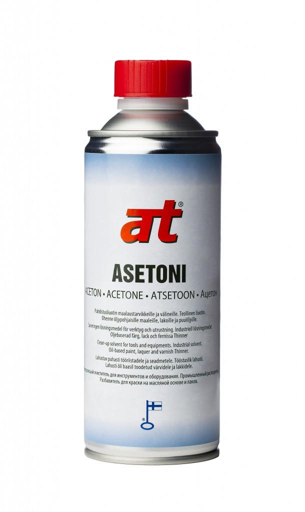 AT asetoni. Rasvanpoistoon ja puhdistukseen puu-, metalli-muovi, ja lasipinnoilta ennen pintakäsittelyä ja liimausta. Nopeasti haihtuva.