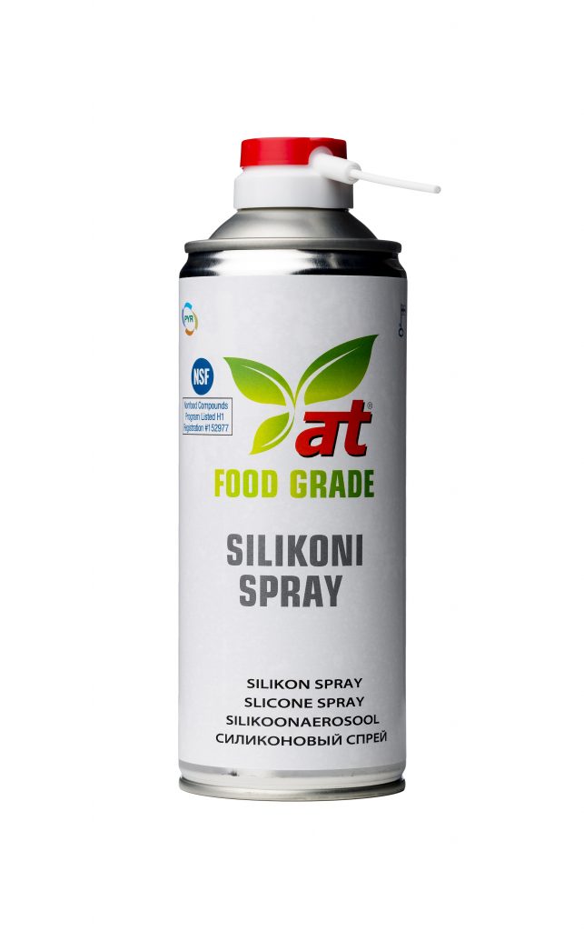AT Food Grade silikoni spray. Moniin käyttötarkoituksiin soveltuva väritön liuku-, erotus- ja voiteluaine. Hyvät eristyskyky- ja vedensieto-ominaisuudet. Öljy on H-1 hyväksytty (USDA). Käyttölämpötila -45°C...+220°C. Kemiallisesti reagoimaton. Ei vahingoita muovi-, kumi- eikä metalliosia.
