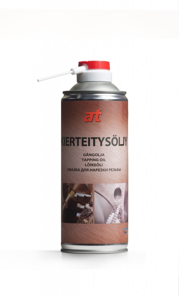 AT kierteytysöljy. Leikkaamiseen, kierteitykseen, poraamiseen ja aventamiseen. Vähentää kuumuutta sekä työkalujen kulumista.