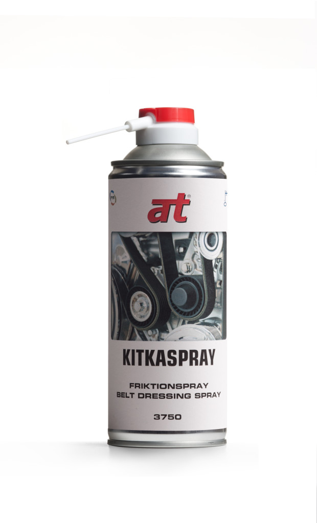AT kitkaspray. Estää hihnojen ja muiden liukkaiden pintojen luistamisen. Antaa hyvän lisäpidon voimansiirto- ja kuljetushihnoihin, sekä pidentää hihnojen käyttöikää. Soveltuu mm. nahka, kumi ja tekstiilihihnoille.