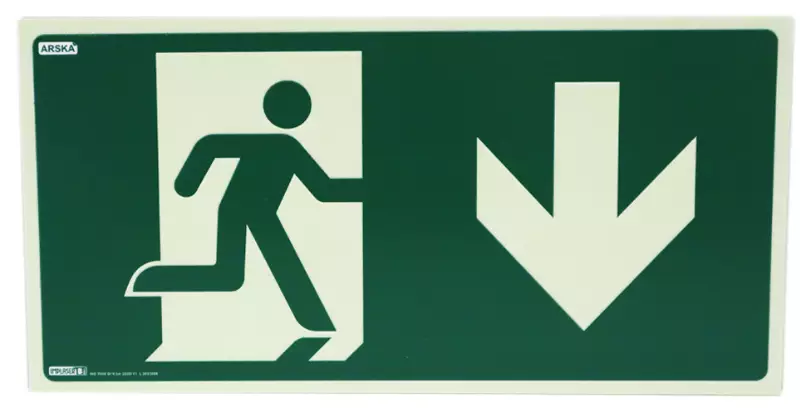 Jälkivalaiseva poistumistieopaste nuoli alas.