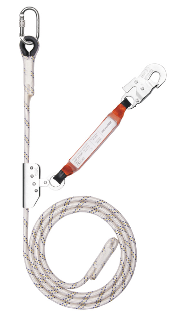 Putoamissuojaimen köysi, 15M. 12 mm turvaköysi tarraimella ja nykäyksenvaimentajalla.