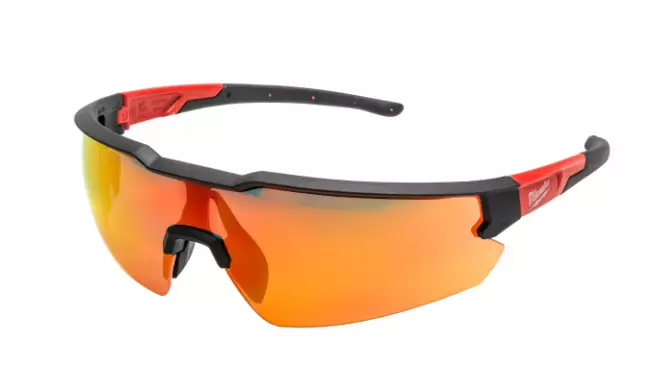 Milwaukee peilipintaiset suojalasit, punainen linssi. Mukavat käyttää koko työpäivän ajan. Joustavat sangat. Peilipintaisissa linsseissä on heijastava pinnoite linssien ulkopuolella, mikä vähentää silemien häikäisyä. EU-sertifioitu: EN166 ja EN170 / EN172.