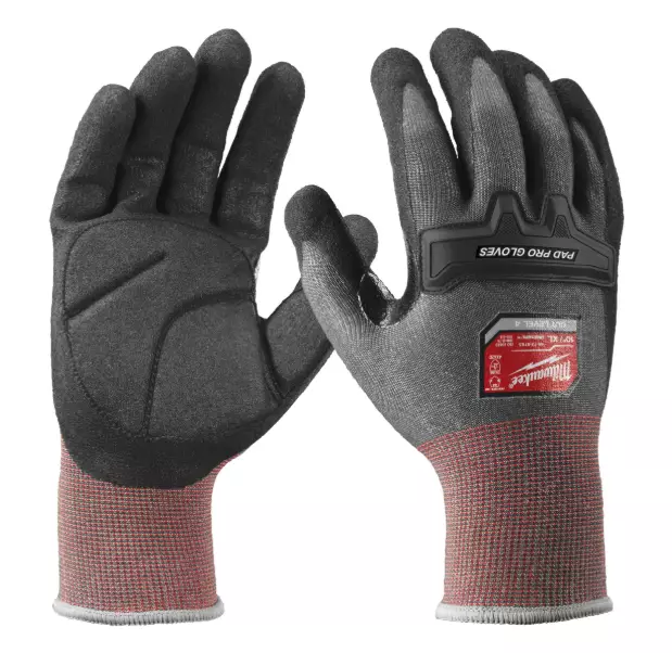 Milwaukee Cut D Pad Pro viiltosuojakäsineet. Vaahtomuovipehmuste kämmenessä tarjoaa lisämukavuutta tärisevien työkalujen kanssa työskennellessä. 18 G materiaali parantaa joustavuutta ja näppäryyttä erityistä tarkkuutta vaativiin tehtäviin. TPR-pehmuste suojaa rystysiä. Vahvistettu nitriilipäällyste antaa lisäsuojan peukalon ja sormien välille. SmartSwipe mahdollistaa älylaitteiden kosketusnäytön käytön käsineet kädessä.